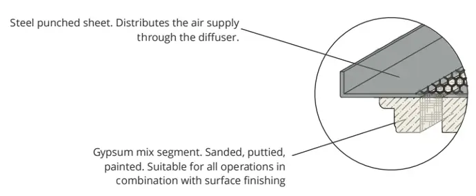 - They are durable. Frameless air diffusers are made from a single piece of gypsum composite, which makes them more resistant to rust and ageing once installed than framed air diffusers made from plastic or steel.